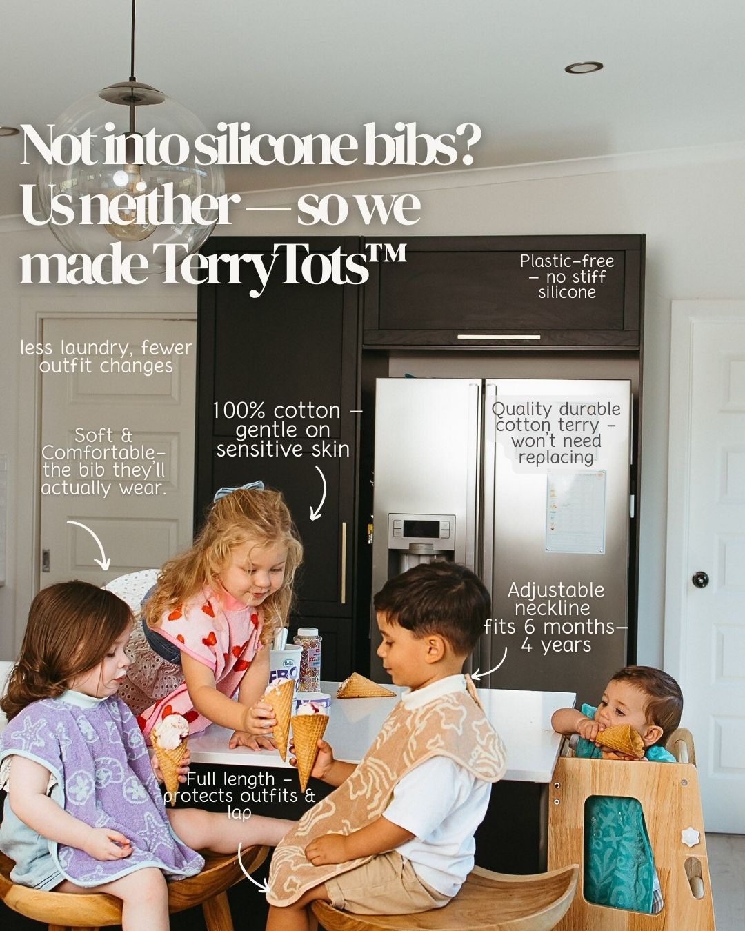 “We love our Looma Bibs! Towel bibs are hands down the best. My bub used to pull off the silicone smocks and would end up with food dropping on his legs anyway — these literally cover everything!”