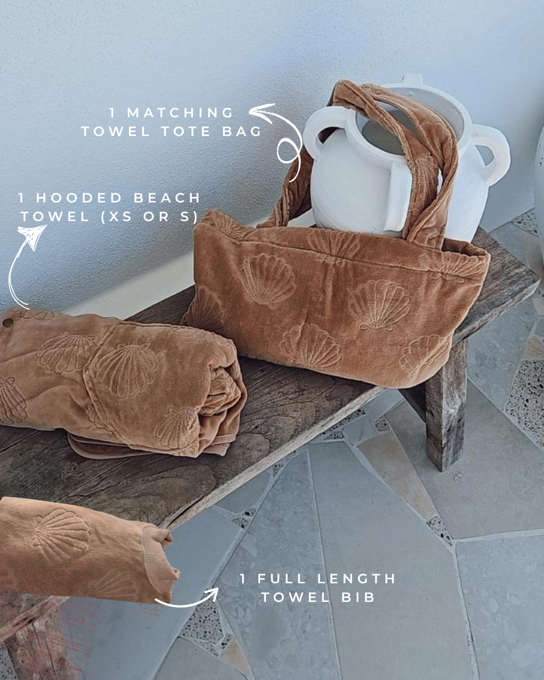 The Beach Baby Bundle includes everything your little one needs for a day at the beach or pool, with luxurious, practical items that are perfect for a day of fun in the sun. Featuring the Seashells Towel Tote Bag, Seashells Luxe Full-Length Towel Bibs, and the Seashells Hooded Beach Towel, this bundle is designed with convenience and comfort in mind, using high-quality cotton towelling for ultimate softness and absorbency.